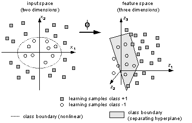threshold b. ![]() Fig. 7: Non-linear -mapping from two-dimensional input space with non-linear class boundaries into a three-dimensional feature space with linear separation by a hyperplane Compared to neural networks the SVM method offers a significantly smaller number of parameters. The main modelling freedom consist in the choice of a kernel function and the corresponding kernel parameters, influencing the speed of convergence and the quality of results. Furthermore, the choice of the cost parameter C is vital to obtain good classification results, although algorithmic modifications can further simplify this task [16]. |